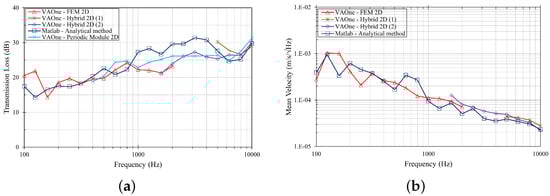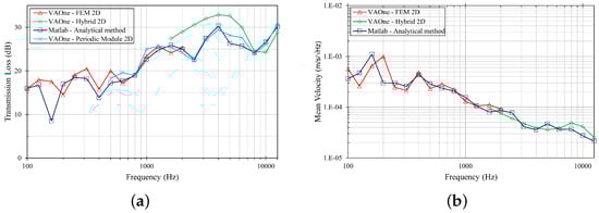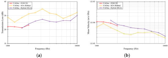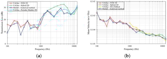 Vibro-acoustic responses of a panel with Hat stiffeners (2D stringers): (a) sound transmission loss and (b) space-average mean vibration velocity.