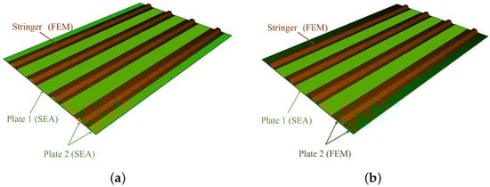 Differently from the case studies presented in Section 4.1 and Section 4.2, now two Hybrid 2D FE-SEA models are realised. The first of them has all skin parts modelled as statistical subsystems while the stiffeners are represented as deterministic subsystems (Hybrid 2D (1)—Figure 17a). In consideration of the small width of the skin parts located below the stiffeners and at the extremities, and in order to obtain a more accurate solution at lower frequencies, an additional Hybrid model was developed (Hybrid 2D (2)—Figure 17b) having also such skin parts modelled as FEM subsystems.