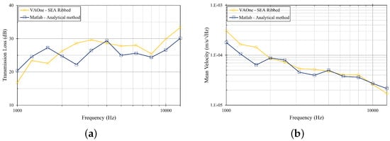 Vibro-acoustic responses of the equivalent SEA Ribbed model (TL optimisation): (a) sound transmission loss and (b) space-average mean vibration velocity.