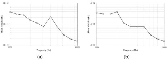 Two objective functions are considered: one with an RMSE that considers only the transmission loss contribution as reference () and another taking into account both the transmission loss and the velocity contribution (). The corresponding equivalent shear modulus obtained are shown in Figure 23.