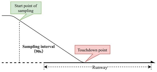 In this article, we focus on the landing phase of a flight. Compared to the entire profile of a normal flight, this phase of a flight is relatively short but has a high percentage of flight accidents. A review of accident statistics indicates that over 45% of all general aviation accidents occur during the approach and landing phases of a flight [34]. Thus, a fixed duration of 90 s before flight touchdown was chosen as the study flight phase for this paper, as shown in Figure 3. For each flight, every flight parameter in Table 1 is sampled at a fixed interval.