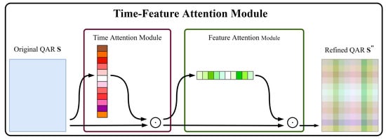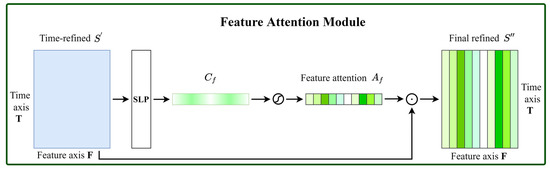 where denotes the Hadamard product operation. In performing the multiplication operation, the time attention values are propagated (copied) along the dimension of the feature parameters, and the feature attention values are propagated along the time dimension. Figure 5 and Figure 6 depict the computation processes of the time attention and feature attention modules, respectively.