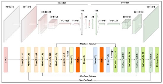 In this paper, we construct a TFA-CAE network model for feature extraction of flight data. Figure 7 shows the structure and parameters of TFA-CAE, in which the TFAM is placed in front of the AE. An original QAR time series is first passed through the time-feature module to generate a refined time series. Within the encoder, multi-convolutional and max-pooled layers are stacked on the refined time series to extract hierarchical features, and all units in the last convolutional layer are then flattened to form a vector followed by two fully connected layers, which are called embedded layers. As the second fully connected layer has two units, the input QAR time series is thus transformed into a two-dimensional feature space (latent space). Designed as a symmetrical form, the decoder then reconstructs the original QAR sequence using the features in the latent space.