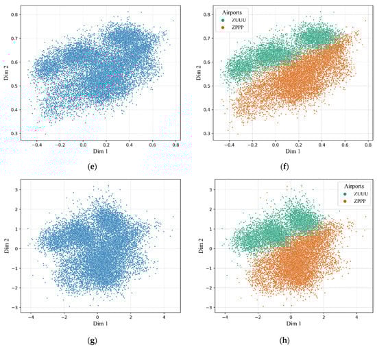 The scatter plots of the extracted flight features. As illustrated, (a) shows the plot of flight features extracted by the TFA-CAE model while (c,e,g) are the flight features extracted by the SA-CAE, GRU-AE, and PCA separately; (b,d,f,h) show the extracted flight features divided by the two airports.
