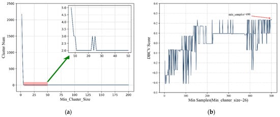 The optimization goal of HDBSCAN is to find the optimal min_cluster_size and min_samples values that yield the maximum DBCV score. Figure 9 illustrates the process of selecting these two parameters. To avoid a loss of generality, we first fixed min_samples to the default setting and iterated min_cluster_size from 2 to 200 while calculating the number of clusters, as shown in Figure 9a. The number of clusters remained at 2 when min_cluster_size was 26 or greater. Then, we fixed min_cluster_size = 26 and iterated min_samples from 2 to 500 to obtain the maximum DBCV score, as shown in Figure 9b. Finally, we chose min_cluster_size = 26 and min_samples = 499 for our case study.