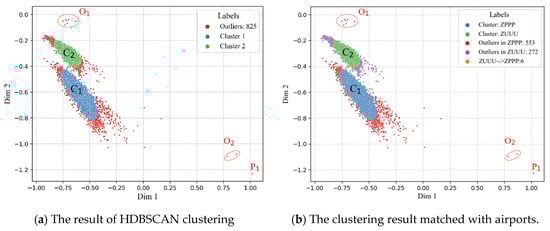 The result of HDBSCAN clustering of flight features is shown in Figure 10a, in which the red points indicate outliers, while the blue and green points represent two clusters, and , respectively. In the case study, a total of 825 outliers were detected. Furthermore, we matched the clustering result of the extracted flight features with the two airports, as shown in Figure 10b. In detail, is a cluster of flights that represents the common landing pattern of the ZPPP airport, while represents the landing pattern of the ZUUU airport. A total of 553 anomalous flights (red points) landed at the ZPPP airport, and 272 anomalous flights (purple points) landed at the ZUUU airport. and are two aggregations of anomalous flights that deviate far from the landing pattern of the ZPPP airport; in each cluster, the flights have similar anomalous characteristics. The point represents a flight with the farthest deviation from the common pattern of the ZPPP airport. One drawback is that six flights (orange points) at the ZUUU airport are clustered into the pattern of the ZPPP airport.