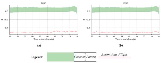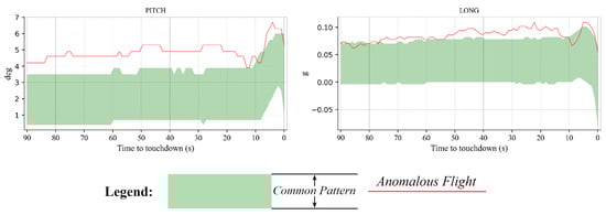 Two examples of anomalous flights that landed at the ZUUU airport are separately displayed in Figure 13 and Figure 14. Figure 13 shows a flight landing with a higher elevation and a larger longitudinal acceleration. The pitch was always much larger than the common elevation angle, although it returned to normal between approximately 8 and 5 s before touchdown. From approximately 80 s before touchdown, the longitudinal acceleration was greater than the common pattern until approximately 10 s before touchdown; it briefly returned to the common range from approximately 10 s to approximately 5 s before touchdown but then increased above the normal pattern until touchdown.
