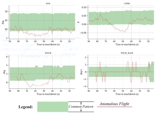 As opposed to the flight mentioned above, a flight landing with a fluctuating attitude and dynamics that are lower than the common pattern is shown in Figure 14. To be specific, the AOA, PITCH, LONG, and PITCH_RATE fluctuated throughout the landing phase, with PITCH_RATE being the most pronounced. Separately, the angle of attack was lower than the common pattern from approximately 75 s to approximately 45 s before touchdown and fluctuated back and forth at the lower limit of the normal range during the subsequent landing. As the result of the larger change rate, the flight pitched up and down with a larger range in the two time periods of 85 to 65 s and 45 s to touchdown. Moreover, the flight landed with the head of the aircraft below the horizontal line from 70 to 45 s before touchdown because its angle of pitch was less than 0. In addition, the longitudinal acceleration was always smaller than the common pattern from approximately 62 s to approximately 42 s before touchdown.