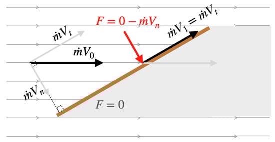 According to the Newtonian theory [1], when a fluid element impinges on the wall, the fluid element loses the momentum component in the direction normal to the wall and exerts a force on the wall whose magnitude is equivalent to the momentum loss, as shown in the schematic in Figure 1.