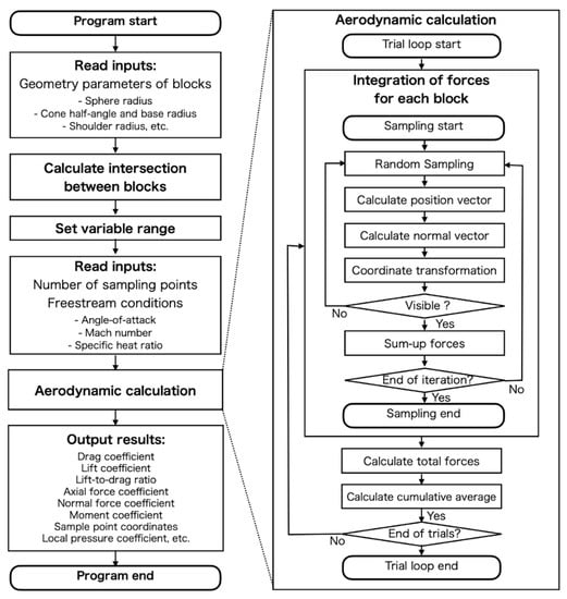 Once the integration ranges are determined, the aerodynamics calculation process starts. For each block, the aerodynamic coefficients are calculated as follows. Two parameters, and , are determined by uniform random number sampling to calculate a point position vector expressed by Equation (25). The normal vector calculated for the sample point is rotated by the input pitch and yaw angles according to Equation (18). If the rotated normal vector has a negative value of x-coordinate, the point is classified as a visible point. The local pressure vectors in Equations (6) and (20) are calculated for the visible points, and the components are summed up for all the visible points. The sampling procedure finishes when the number of sample points reaches the intended maximum value. Then, the aerodynamic coefficients for the block are determined for the sums of the pressure components according to Equation (30). The aerodynamic coefficients for the whole object are calculated as the sums of the coefficients of the blocks. This trial is repeated for the times that the user input. After each trial, cumulative averages of the coefficients are calculated.