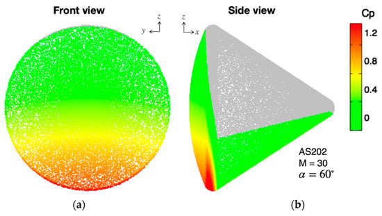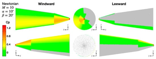 It is known that the Newtonian theory gives a good approximation for the aerodynamic coefficients of an object in the hypersonic flowfield with a high Mach number [1]. Under the Newtonian theory, pressure coefficients on a surface due to fluid impingement can be calculated in a simple way; the pressure coefficients from the Newtonian theory depend only on an angle between the flow direction and the surface’s normal direction, and it does not need information on the flowfield around the surface. Of course, for accurate predictions of the aerodynamic coefficients, it is necessary to simulate the flowfield including physics that can alter the pressure distribution on the surface, such as viscosity, thermal excitations, chemical reactions, and so on [2,3]. However, Computational Fluid Dynamics computations considering these complex physics are generally time-consuming. Even though the prediction accuracies are degraded, simpler methods, such as the Newtonian theory, are often preferred, particularly at the initial stage of designing a hypersonic space vehicle.