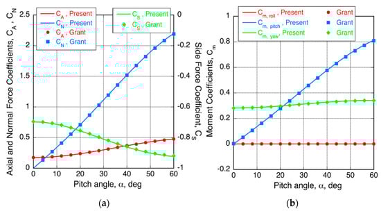 The calculated axial, normal, and side force coefficients are compared with Grant’s result in Figure 6a, and the rolling, pitching, and yawing moment coefficients in Figure 6b. The variations of coefficients according to the change in the pitching moment in the present results agree well with the Grant’s results.