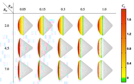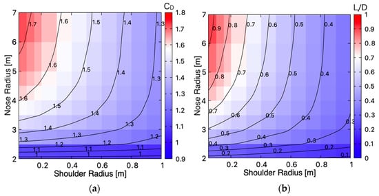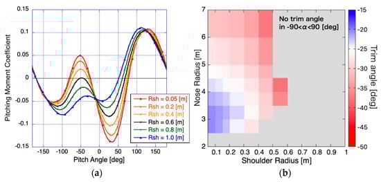 Now, the parametric study is performed by varying the nose and the shoulder radius in the range of 2 < < 7 m and 0.05 < < 1 m, respectively. The surface local pressure distributions for selected cases are shown in Figure 11. It is shown that the connections between the nose sphere, the shoulder, and the frustum cone are well defined for all the cases. The obtained drag coefficients at 0-degree angle-of-attack and the maximum lift-to-drag ratio are shown in Figure 12 as maps on the nose and the shoulder radius field. It is shown that these aerodynamic coefficients increase as the nose radius increase but decrease as the shoulder radius increases. It is also shown that aerodynamic coefficients are insensitive to the shoulder radius when the nose radius is close to the fixed base radius, < 1.9558 m. Figure 13 shows the variation of the pitching moment about the fixed center of gravity and of the stable trim angle when the nose and the shoulder radius are changed. As seen in Figure 13a, the absolute peak values of the pitching moment as well as the gradient of the moment with respect to the pitch angle decrease when the shoulder radius increase. For the cases with a large shoulder radius, the stable trim angle cannot be found in the range −90 < < 90 deg, as seen in Figure 13b. It is shown that the absolute value of trim angle increases with the shoulder radius increases and has a minimum value for the nose radius variation.