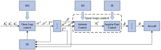 The IBS is applied in the outer-loop control, and it follows the trajectory command and produces thrust command T and virtual control input , as the desired attitude signal, while the SE is used to limit , , T, and , , . The inner-loop control consists of attitude control and angular rate control, where BS and IB are applied, respectively. The attitude control loop is to follow the attitude signals given in the velocity control loop and provides the desired angular rate signal . Finally, the objective of the angular rate control loop follows and generates the effector deflection command .