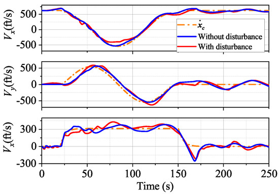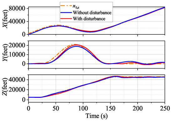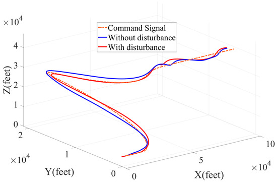 The results of simulation 1 are shown in Figure 5, Figure 6, Figure 7, Figure 8, Figure 9, Figure 10, Figure 11, Figure 12, Figure 13 and Figure 14. It can be observed from Figure 5 and Figure 6 that the presence of disturbances do not significantly affect the trajectory tracking performance of the controller. From Figure 7, Figure 8, Figure 9, Figure 10, Figure 11 and Figure 12, we know that the overshoot and regulation time of the rest of the signals are not affected very much, either. The robustness of the proposed controller is satisfactory.