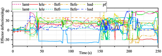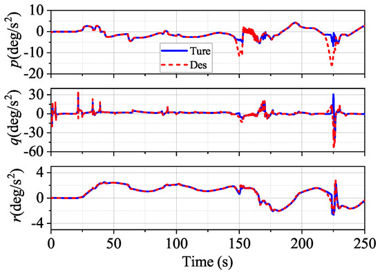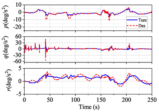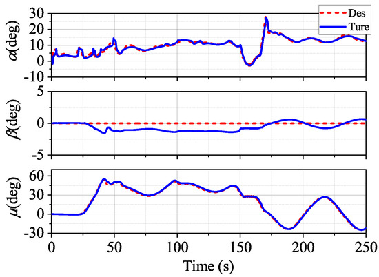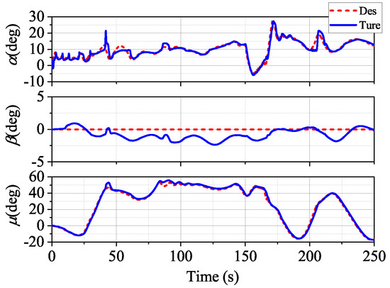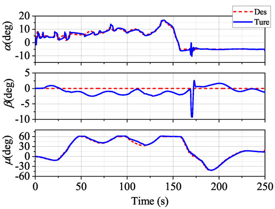 Note that the control surface is designed to produce aerodynamic moments. Compared with the attitude angles, the contribution of control surfaces to aerodynamic forces is relatively small, which means is smaller than . In addition, in small time increments, is also bounded. Thus, it is believed that is bounded.