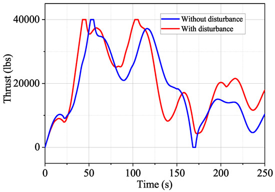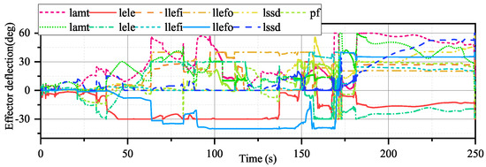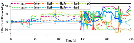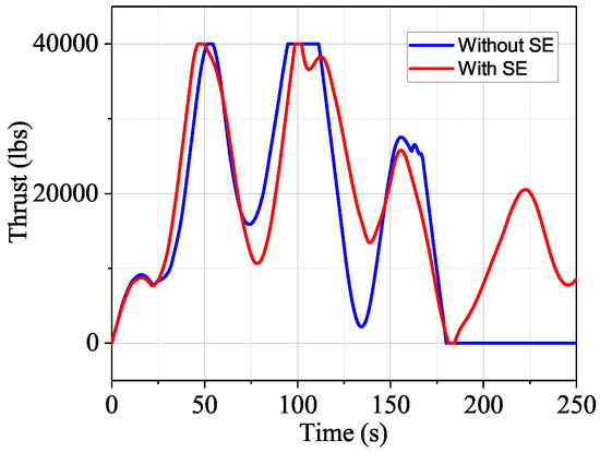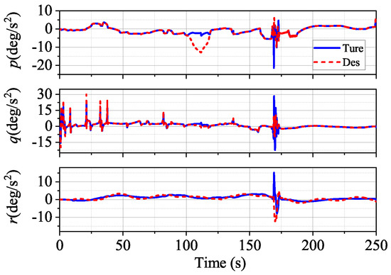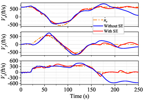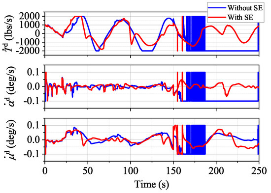 From Figure 18 and Figure 20, we know the inner-loop control works well, so the problems come from the outer-loop control. From Figure 18, Figure 19, and Figure 21, we see that, compared with the controller with SE, the absence of SE causes saturation in , , and T, respectively. In Figure 21, T reaches the amplitude limits around 100 s, but the aircraft is still in control. It appears that the amplitude saturation endures to some degree, and the direct reason the aircraft loses control is that the virtual control input reaches the rate limit around 175 s, as shown in Figure 19. To conclude, the system is more sensitive to rate saturation.