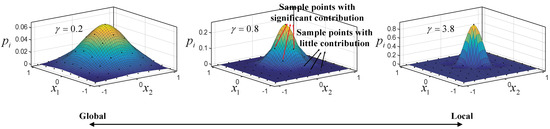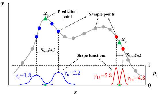 where the characteristic length of a given prediction point is calculated by finding the nearest sample points around , and then finding the nearest sample point to . Thus, the Euclidean distance between and is defined as of . In the previous report [18], usually ranges from 0.1 to 6.8. It determines the support width of the LME basis functions, which introduces a seamless bridge between local approximation and global approximation as shown in Figure 1. Obviously, the LME basis functions are allowed to depend on the location of the prediction point and have the potential to adjust themselves adaptively by varying to achieve optimal degrees of locality, which provides a great advantage for the construction of high-order approximations. The basis function itself covers all global sample points, but the locality of the basis function determines the contribution of each sample point to the predicted point. By setting a truncation error (e.g., ), the sample points with minimal contributions can be ignored. Therefore, by controlling the locality of the basis function, the global and local capabilities of the surrogate model can be adjusted. As shown in Figure 1, as increases, the basis function support width gradually narrows, and with fewer sample points with a significant contribution included, the local ability will be stronger. On the contrary, the global capability will be strengthened.