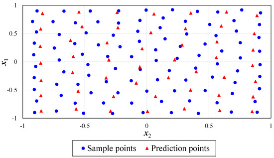 That is, in the gravity center Voronoi diagram, the generating point of each Voronoi unit happens to be the gravity center of the unit. Currently, forms a set of CVT points. Figure 3 shows a set of CVT points in a two-dimensional space with 100 sample points and 50 prediction points. It can be observed that the sample points and prediction points evenly cover the entire design space.