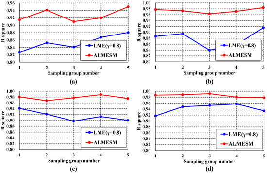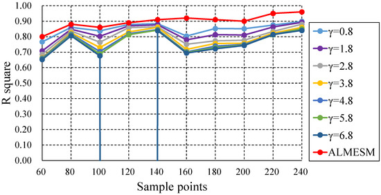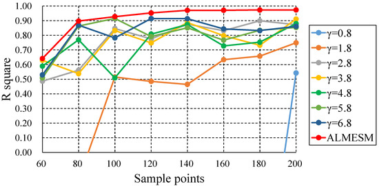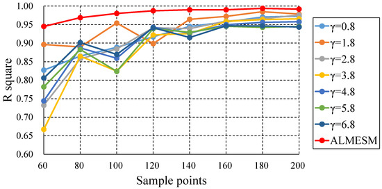 R-squared comparison of ALMESM, and the original LME approximation with different globally unified under different number of sample points in the 6-D function.