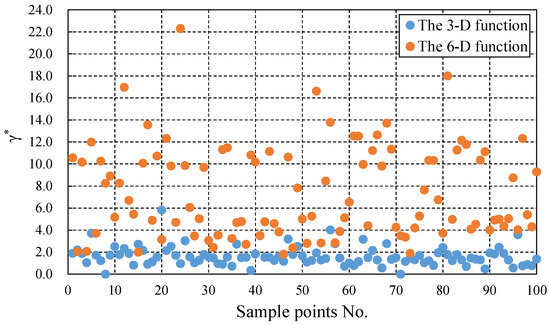In the 3-D function (Figure 5), the accuracy of the original LME approximation changes significantly with when the sample size is small. As the sample size increases, the accuracy gradually stabilizes. However, when the dimension increases (Figure 6), the accuracy of the original LME approximation is greatly influenced by and the number of sample points. The accuracy varies widely, and even negative values appear. This is because when the number of sample points increases, the global and local nonlinearity of the original function will be more prominent, making the basis function that was originally applicable to a smaller number of sample points not applicable at this time, resulting in reduced accuracy. The original LME approximation cannot automatically adjust to change the locality of the basis function. Thus, it leads to low accuracy. In contrast, it can be observed from the two examples that ALMESM always maintains high accuracy. ALMESM can automatically adjust so that the basis function can be adaptively adjusted in various situations. Therefore, under different sample points, it can be stabilized with high accuracy. Figure 7 shows the optimal of each sample point obtained by ALMESM in the two examples. It can be observed that the increase in the dimensionality and the degree of nonlinearity causes the of each sample point to vary more drastically than the 3-D ones. The reason is that the nonlinearity of the 6-D function is more severe than that of the 3-D function, and the basis functions with higher are required to capture local features. Therefore, the large amount of the optimal obtained by ALMESM for the 6-D function are quite large (>10.0) and it is difficult to achieve higher accuracy with a globally unified . In summary, compared to the original LME approximation, ALMESM improves the accuracy and stability of the calculations.
