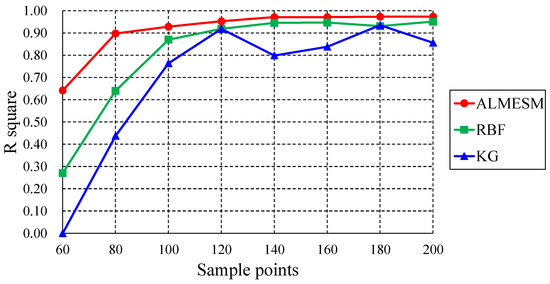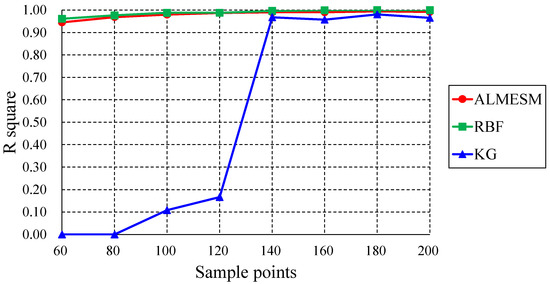 R-squared comparison of ALMESM, RBF, and KG under different number of sample points in the 6-D function.