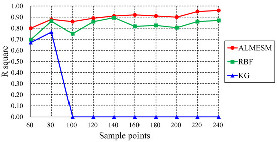 A total of 10 sets of sample points (Table 5) were selected to test the accuracy of the surrogate model by using CVT sampling. To verify the performance of the model proposed in this article, we compared it with the original LME approximation with a globally unified , RBF, and KG. From Figure 12, the accuracy of the original LME approximation is greatly influenced by and the number of sample points. An improper value of can even lead to a negative value of ( = 6.8, 120 sample points). In contrast, under different sample points, the accuracy of ALMESM can always be maintained at a high level, and even the lowest accuracy is higher than 0.80. Overall, the accuracy tends to increase as the number of sample points increases. When the number of sample points is 240, the accuracy of ALMESM reaches 0.96, and gradually tends to converge. In summary, compared to the original LME approximation, ALMESM realizes the automatic optimization of for each sample point, and improves the accuracy and stability of calculations. From Figure 13, KG has a certain prediction accuracy when the sample is small. However, as the number of sample points increases (>80), the predictive ability of KG is lost in this highly nonlinear engineering case. This phenomenon was also reported in literature [18]. The KG model is a local approximation scheme; the correlation matrix can become singular if multiple sample points are spaced close to one another. Under a different number of sample points, the accuracy of ALMESM and RBF can be maintained at a high level. However, the ALMESM has higher accuracy overall. When the number of sample points is 100, the difference of between ALMESM and RBF is the largest, with a value of 0.11. In summary, ALMESM can achieve higher accuracy for approximating the LCF life of the GH720Li turbine disk considering geometric uncertainty.