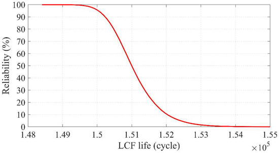 Subsequently, the LCF life reliability of the turbine disk was calculated using ALMESM, and the LCF life value under different reliability was obtained. Since the accuracy of ALMESM gradually converges when the number of samples is 240 (Figure 13), the surrogate model established at this time was used for TDRA. A total of 100,000 sample points were created by using the MC random sampling method. By conducting MC simulations 100,000 times on ALMESM the frequency histogram of the LCF life was obtained, as shown in Figure 14. It can be observed that the LCF life approximately obeys the lognormal distribution within the scope of the sampling. The minimum LCF life is 148,392 cycles and the maximum LCF life is 154,896 cycles. When the LCF life equals 150,892 cycles, it reaches the highest frequency of 0.057. In addition, the reliability–life curve was obtained as shown in Figure 15. It is evident that although the variation of the dimensional tolerance is small, it still has a significant contribution to the LCF life of the turbine disk.