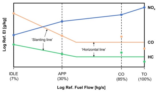 Figure 1 shows an example of how EIs are interpolated based on the logarithmic relationship between EI and fuel flow, using the BFFM2 method [35]. Furthermore, methods are also presented to account for the remaining key emission species, such as the Derivative Factor method [28] used to approximate the EI values for VOCs such as non-methane HC (NMHC) throughout flight and the First Order Approximation method [23] used to estimate PM emission indices. The choice of method generally depends on the emission species to be observed, the compromise between modelling resources and data availability, and the level of accuracy required.