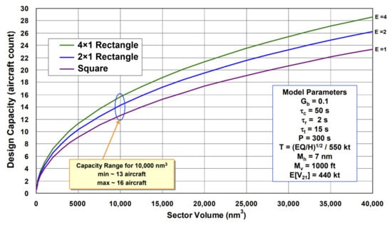 As density and complexity levels of air traffic increase, so does the mental workload of the air traffic controller, up until a threshold level is reached where the controller can no longer safely handle the situation. The maximum number of aircraft permitted by the ATC team in charge of a particular airspace volume is known as the airspace capacity, and is driven by the airspace situation, state of equipment being used, and the controller’s own mental state [73]. Airspace capacity is limited more by controller workload than it is separation laws, meaning human cognition is the true limiting factor on the number of aircraft that can occupy a particular airspace volume at a particular time [67,74]. Therefore, models of controller workload are often used to estimate airspace capacity, in which ATC tasks are modelled to determine a safe upper limit on workload. In Welch et al. [74], a macroscopic workload model is proposed which generalises ATC tasks into four distinct categories: background, transition, recurring and conflict tasks. This provides an objective basis for estimating capacity and enables the formulation of an analytical relationship between airspace capacity and sector volume, as seen in Figure 6.