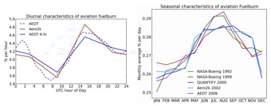 The nature of air traffic and emissions distribution was investigated in Olsen et al. [77] where a range of global aircraft emissions datasets are compared (NASA-Boeing 1992, NASA-Boeing 1999, QUANTIFY 2000, Aero2k 2002, AEDT 2006 and aviation fuel usage estimates from the International Energy Agency) to show distribution patterns in the latitudinal, longitudinal and vertical sense. Further to this, temporal variations with respect to both the diurnal (time of day) and seasonal (time of year) cycles are explored.