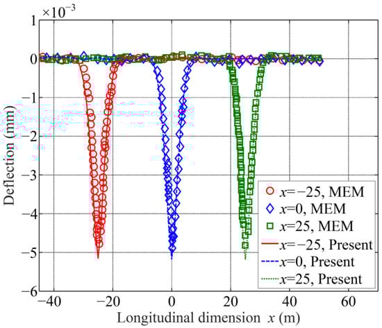 It should be mentioned that this problem was solved with three different nodal arrangements and convergence of the results was assessed accordingly. However, for the sake of conciseness, the results of all nodal arrangements are not reported herein. The reported results correspond to a uniform arrangement of 101 × 11 nodal points, and the time step size is Furthermore, the total number of integration points is 17,472. Figure 3 depicts the deflection of the plate along its longitudinal centerline at three different time instances. In this figure, results of the meshfree RPIM are compared with those of the MEM [34] and a close agreement is observed.