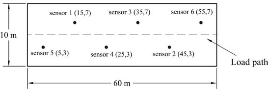 In this example problem, the plate of the previous example is used for identification of the time variations in the applied moving force. The plate dimensions are and the force moves along the centerline of the plate, as shown in Figure 4. The positions of six velocity sensors are also shown in this figure.