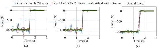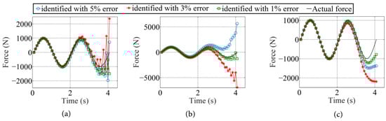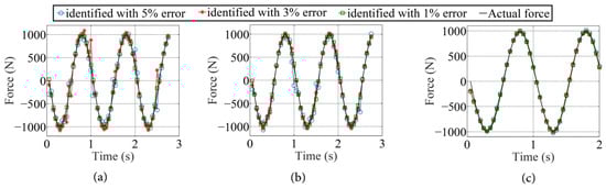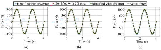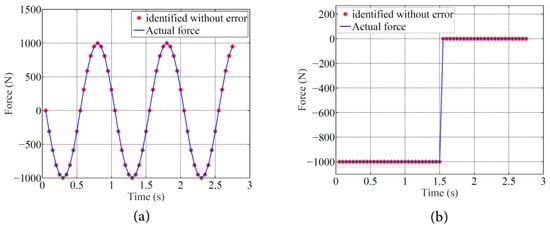 When there are no measurement errors, the identification of the moving load is achieved with only four sensors and no need of regularization. Figure 6a,b depict the identified time variations in the moving load for the sinusoidal and step function, respectively. It is seen that the actual and identified forces are almost the same.