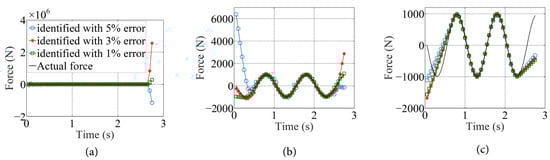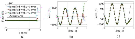 The identified sinusoidal load with six sensors and (a) no regularization, (b) , and (c) .