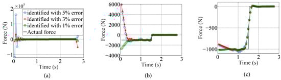The identified load with two sensors and (a) no regularization, (b) , and (c) .