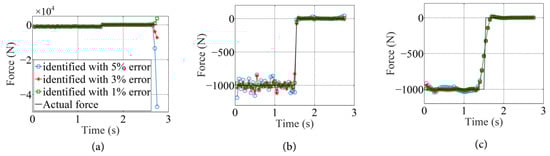 The identified step load with six sensors and (a) no regularization, (b) , and (c) .