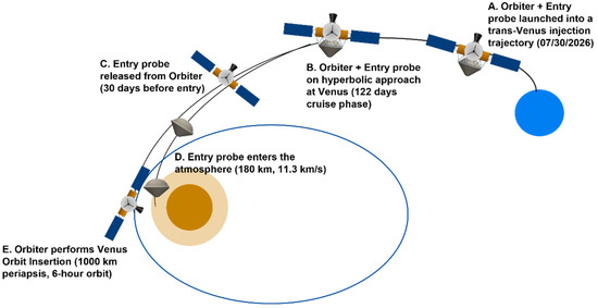The stacked orbiter-probe spacecraft is launched from Earth in July 2026 and reaches Venus after about 120 days. We choose the 2026 launch date to meet one of the goals of the VLF mission study—to identify the earliest possible opportunity to accelerate and catalyze further exploration of the Venus atmosphere. The probe separates from the orbiter about 30 days before entering the Venus atmosphere. The orbiter inserts into a Venus orbit with a 6-h period and 1000 km periapsis altitude. Figure 1 shows a schematic of the mission architecture.