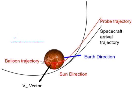 Thirty days prior to entering the Venus atmosphere, the entry probe separates from the orbiter and continues towards the targeted entry location. This separation imparts a small impulse on the orbiter, and so two days are allotted for orbit determination following entry probe separation. After the orbit determination period, the orbiter performs a propulsive deflection maneuver with a ΔV of up to 200 m/s to raise its periapsis out of the atmosphere to an altitude of about 1000 km and adjust the relative geometries of both spacecraft so that the orbiter is in line of sight with the balloon during entry and inflation. Figure 2 shows the arrival geometry of the spacecraft.