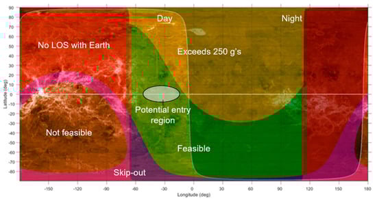 The probe entry location is determined by various factors. Figure 3 shows the 2-D projection of the probe entry locations colored based on the feasibility. The entry flight path angle depends on the arrival geometry and, in turn, determines the latitude regions accessible. The potential entry region is selected such that the probe is in line of sight with Earth during entry and the balloon deployment is near the equator so that the balloon trajectory does not drift significantly along the longitude direction.