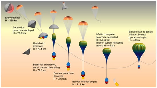 - At approximately 73 km altitude, the heat shield and backshell separate, and the aerial platform is released. The descent parachute is deployed at roughly 72 km and balloon inflation begins.