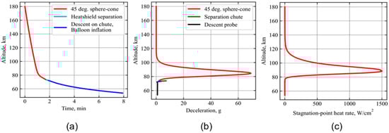 (a) Altitude vs time. (b) Deceleration profile showing peak deceleration = 69 g. (c) Aerodynamic heating profile showing peak heat rate = 1502 W/cm2. The deceleration load and heat rates can be reduced with a shallower entry and lower ballistic coefficient of entry vehicle.