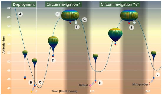 The super-pressure balloon is carried by Venus’s super-rotating atmosphere around the planet and circumnavigates in roughly five days, completing about six circumnavigations over 30 days. The thermal effect of the Venus diurnal cycles on the balloon’s lifting gas density is a key contributor to the altitude control strategy of the aerial platform. In careful concert with diurnal effect timing, altitude change is affected by ballast release to increase altitude and venting of lifting gas to initiate a descent. The inflation system and mini probes act as ballast, with the probes enhancing science return at the same time.