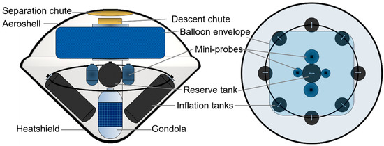 - An entry probe that carries the aerial platform and inflation system. The system survives a peak heat rate of ~1.5 kW/cm2 and peak deceleration of 69 g and deploys the aerial platform at around 50 km altitude.