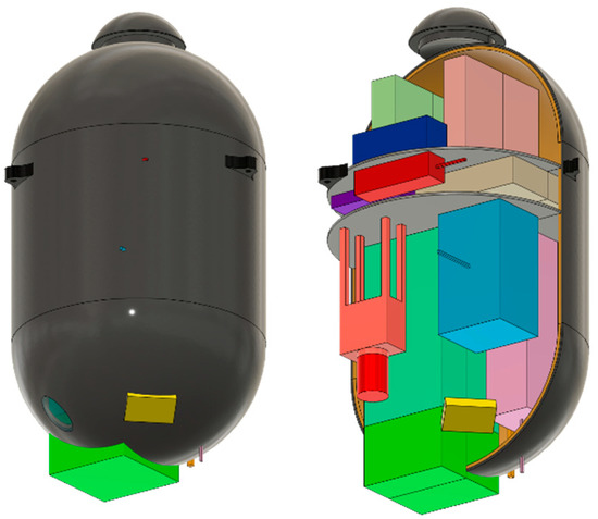 A notional schematic of the gondola pressure vessel with the instruments and subsystems placed on shelves inside the vessel.