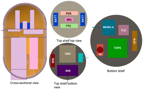 Schematic of the entry probe showing the notional accommodation of the subsystems inside the probe. (Left) Side view, (Right) Top view.