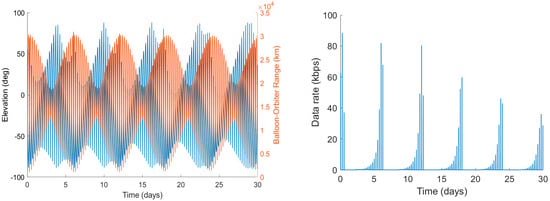 Communication link between balloon and orbiter. Left: Elevation and range of orbiter with respect to the balloon. Right: Data rate of downlink over 30 Earth days. The orbiter has about 16 contacts with the balloon over one circumnavigation, each of roughly 8 to 10 min duration. We assume that the balloon circumnavigates Venus in six days and drifts 10 degrees longitudinally over 30 days. The drift is calculated based on Venus GRAM wind models.