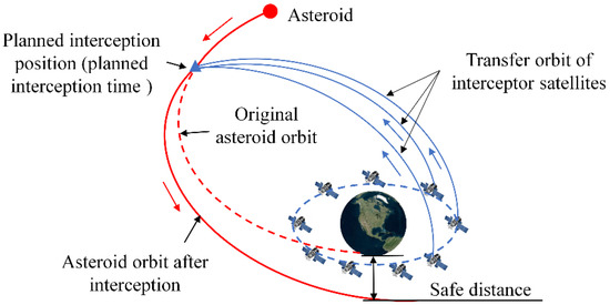 Due to the poor mission robustness and mission inefficiency of a single interceptor satellite, multiple interceptor satellites are needed to intercept an asteroid cooperatively at the same predetermined intercept position to change the flight orbit of the asteroid and keep it at a safe distance from the Earth. A schematic diagram of the cooperative asteroid-interception scene in this study is shown in Figure 1.