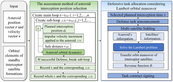 In terms of asteroid defence, existing research has focused on trajectory prediction, risk assessment, and defence approaches. Yu et al. designed indirect and direct transfer trajectories to rendezvous with NEAs and proposed two assessment methods of the accessibility of NEAs using stand-alone CubeSats [19]. There are two main categories of in-orbit treatments for threatening asteroids. The first is a transient action approach based on kinetic impact, and the second is a long-term action approach based on laser ablation, dragging, and gravitational traction, which is still in the conceptual exploration stage. The National Aeronautics and Space Administration (NASA) and European Space Agency (ESA) have collaborated on the Asteroid Impact and Deflection Assessment (AIDA) mission to test asteroid dynamics impact techniques and asteroid deflection effects [20]. Wagner et al. investigated the target selection for a hypervelocity asteroid interceptor flight validation mission and validated the effectiveness of a Hypervelocity Asteroid Intercept Vehicle (HAIV) concept [21]. On this basis, Wie et al. presented a new mission concept of exploiting a multiple kinetic-energy impactor vehicle (MKIV) system that does not employ nuclear explosives to disrupt or pulverise hazardous asteroids with a short warning time [22]. Existing asteroid defence means are primarily aimed at defending against asteroids outside the Earth’s gravitational capture range in the expectation of breaking the asteroid or deflecting its orbit. However, some asteroids are discovered only a short time before they impact the Earth. When these threatening asteroids are discovered, they have already invaded the sphere of the gravitational influence of the Earth and are approaching the Earth. However, for the asteroid with a short warning time and close distance, disruption is usually considered, and coordinated defence by multiple interceptor satellites is rarely considered [22].