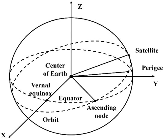 where denotes the semi-major axis of the orbital plane, denotes the eccentricity, denotes the orbital inclination, denotes the right ascension of the ascending node, denotes the argument of perigee, and denotes the true anomaly.